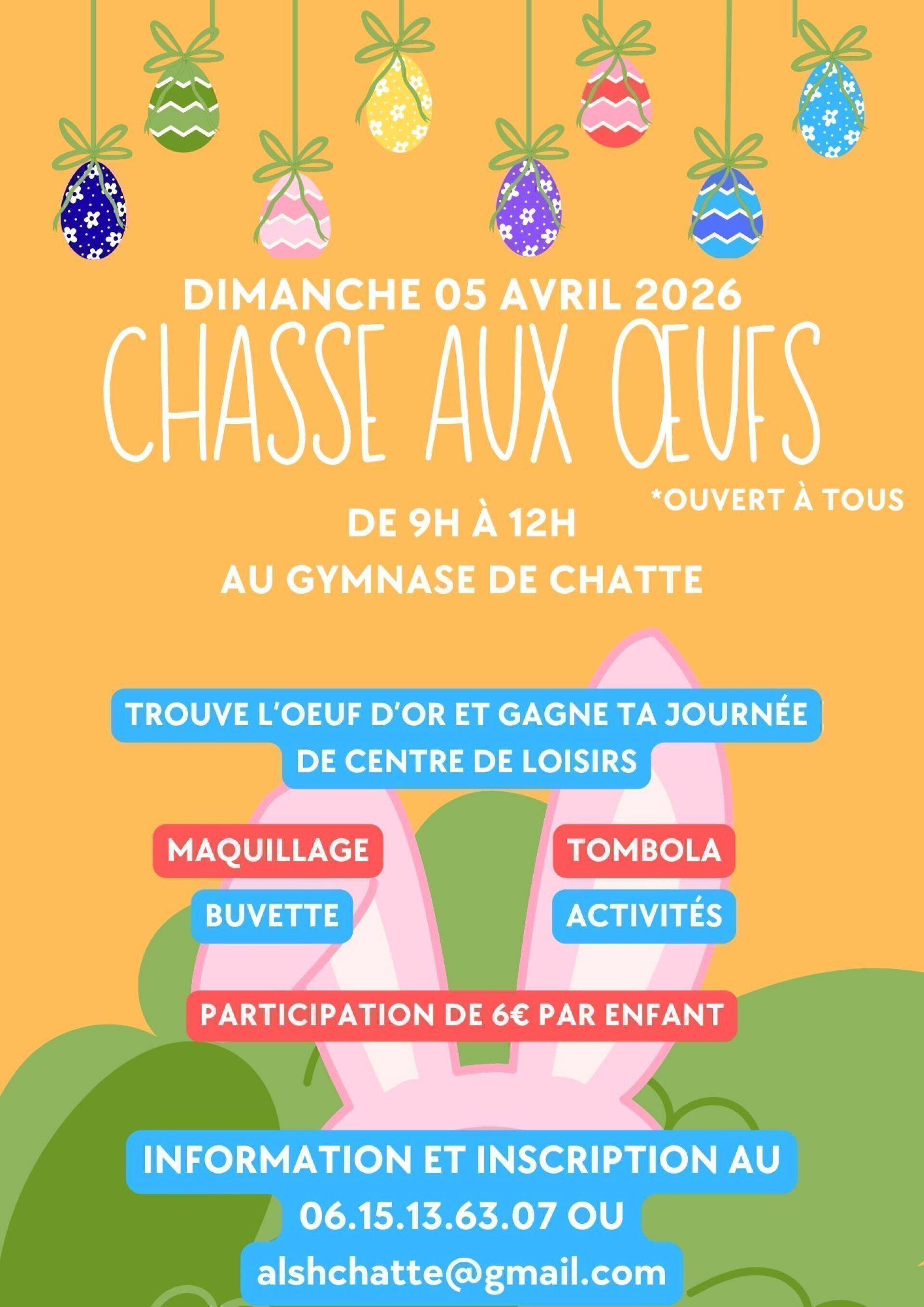 Chasse aux œufs ouverte à tous, avec maquillage, buvette, tombola et activités. Trouvez l'œuf d'or et gagnez une journée de centre de loisirs.