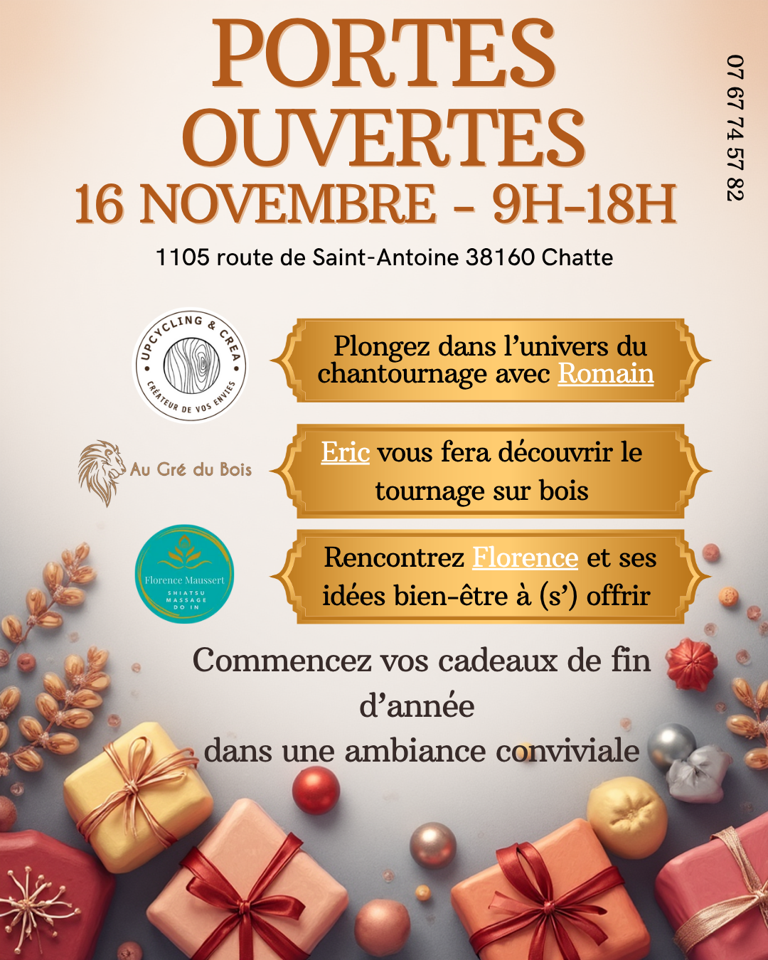 Venez rencontrer Romain (Upcycling & Créa) pour explorer l'univers du chantournage, Éric (Au Gré du Bois) qui vous fera découvrir le tournage sur bois, et Florence (Shiatsu – Massage – Do-In) pour échanger autour du bien-être et trouver des idées cadeaux à (s')offrir