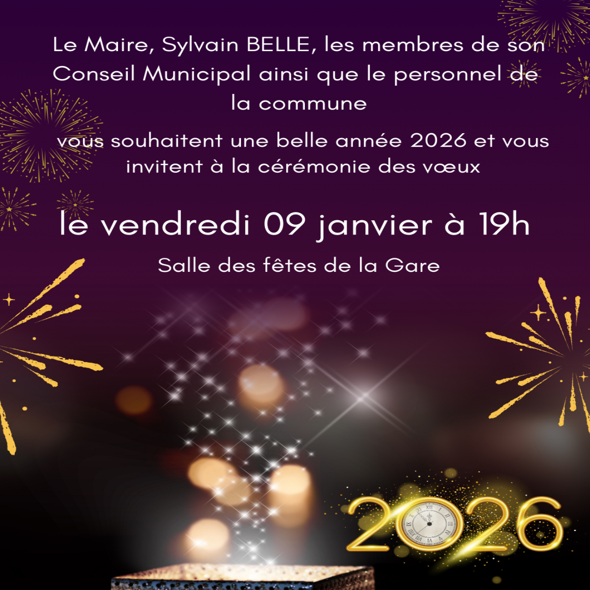 La cérémonie des vœux du Maire aura lieu vendredi 9 janvier 2026 à partir de 19h à la salle des fêtes de la Gare.